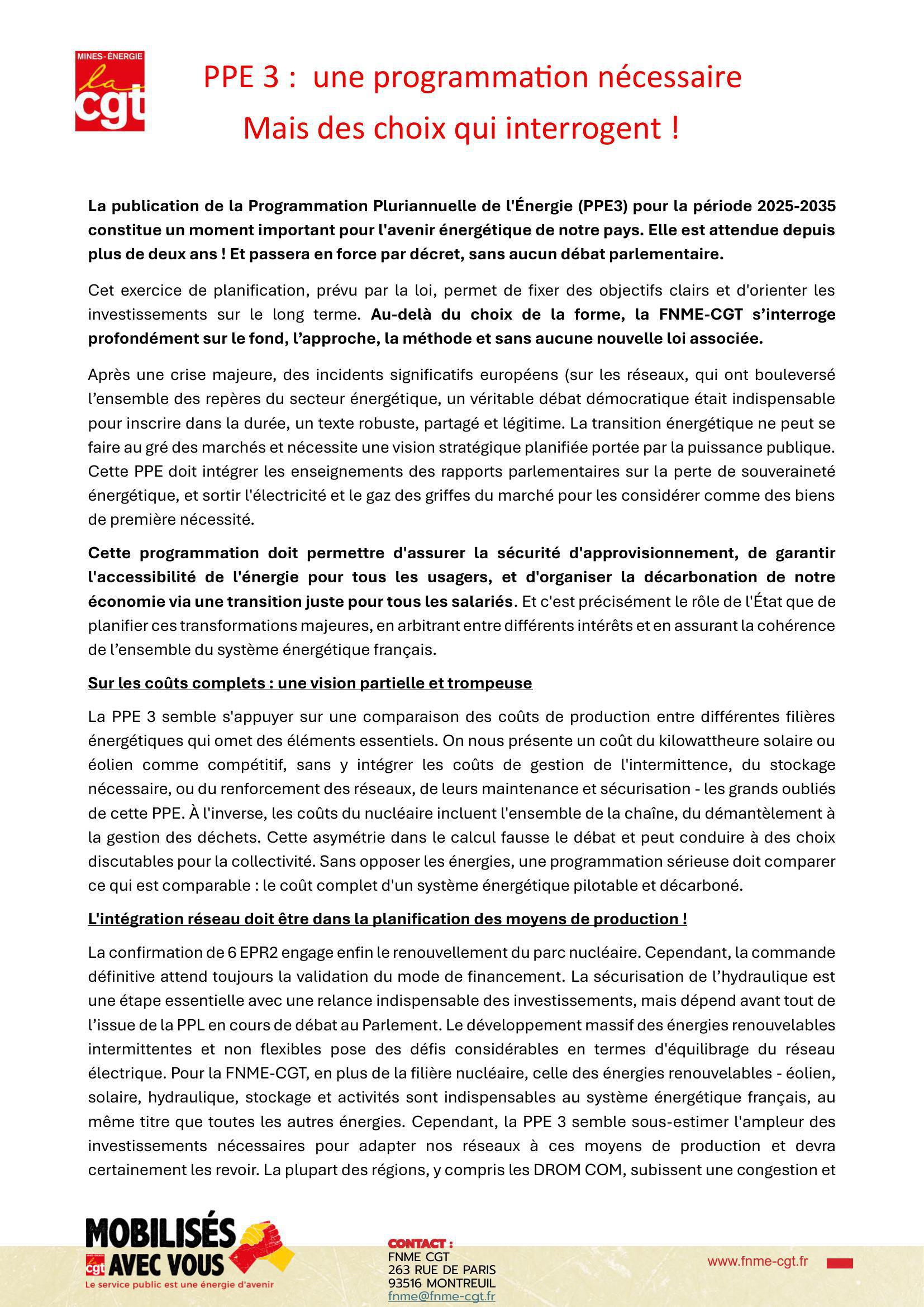 La FNME‑CGT réagit à la publication de la Programmation Pluriannuelle de l’Énergie (PPE3) 2025‑2035, jugée importante mais adoptée sans débat parlementaire, ce qui soulève de fortes critiques tant sur la méthode que sur le fond.