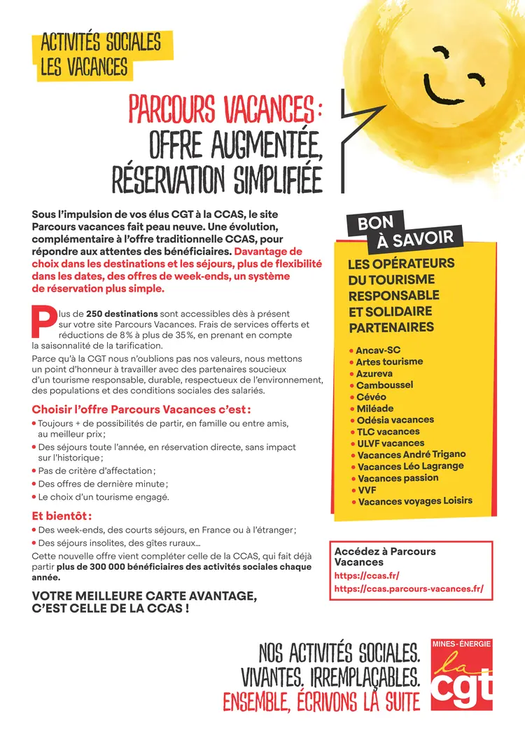 Envie de partir quelques jours, plusieurs semaines, en solo, en famille ou avec des amis, en réservation directe ou en tour de rôle selon le village vacances ou la saison. À chacun le séjour qui lui convient pour recharger les batteries, faire de nouvelles rencontres en France ou à l’étranger. Participez aux propositions culturelles et/ou sportives pour découvrir de nouvelles disciplines ou tentez, pourquoi pas, l’expérience si singulière et enrichissante humainement des séjours solidaires.